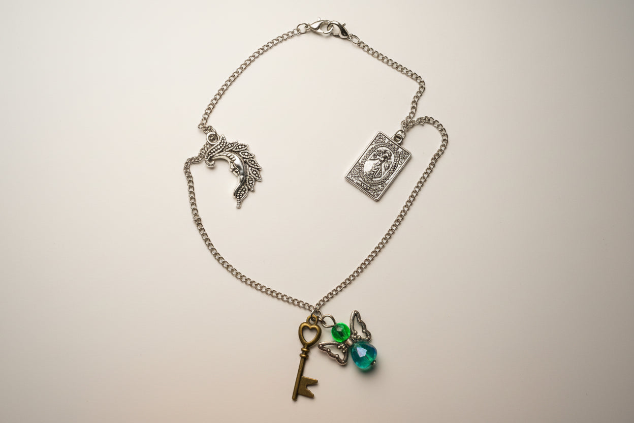 Discover your truth with our End of the Road Anklet. Featuring a half moon charm, The World Tarot symbol, and a bronze key, this anklet represents new beginnings and unlocking potential. The green angle adds a pop of color, making it a stunning addition to your wardrobe.